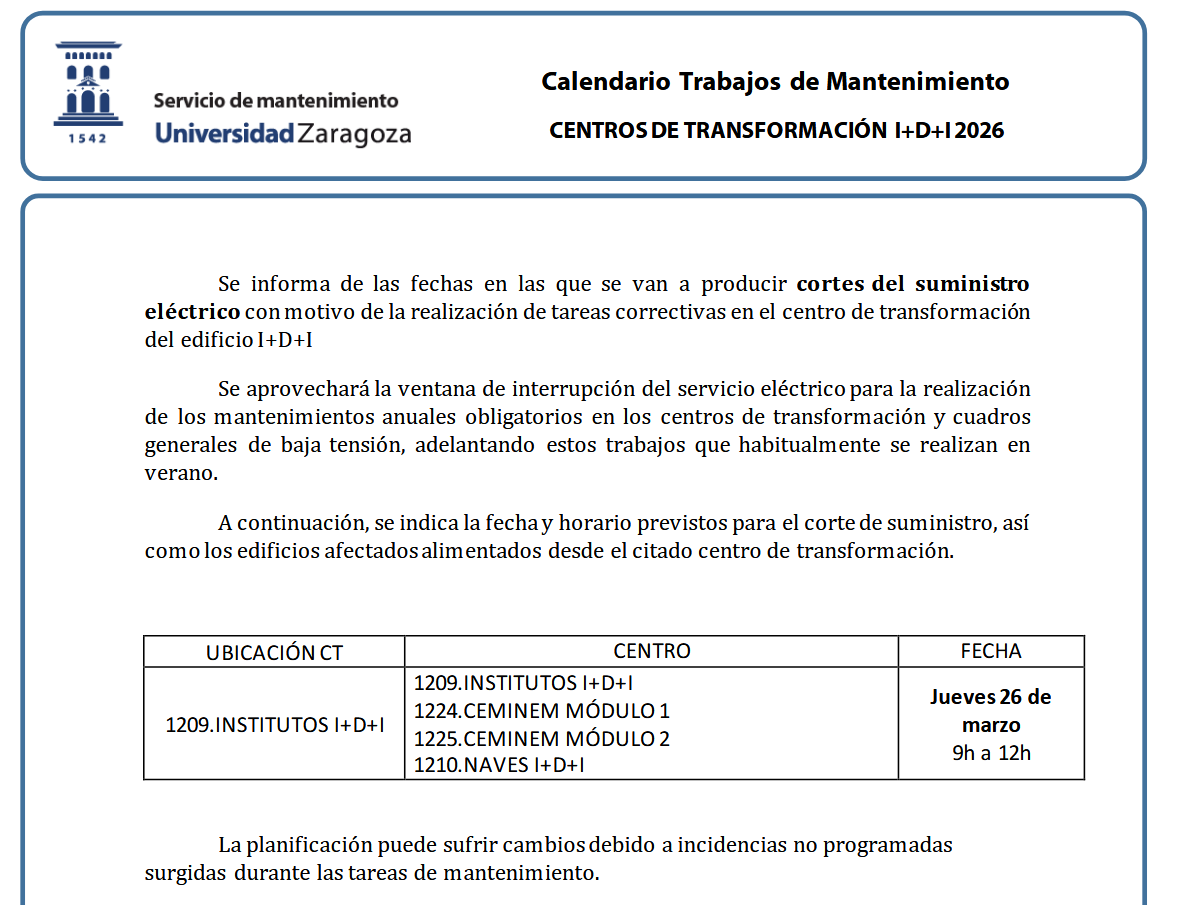Desde el Servicio de Mantenimiento nos informan de la fecha en la que se va a producir cortes del suministro eléctrico con motivo de la realización de tareas correctivas y preventivas en el centro de transformación del I+D.